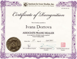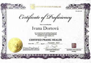 Prošla jsem certifikovanými programy pro praktiky Pranic Healing - Přidružený pránický léčitel (1.stupeň) a Certifikovaný pránický léčitel (2.stupeň). Úspěšně tuto metodu praktikuji a pomáhám lidem zlepšit a vyřešit jejich zdravotní i psychické problémy.